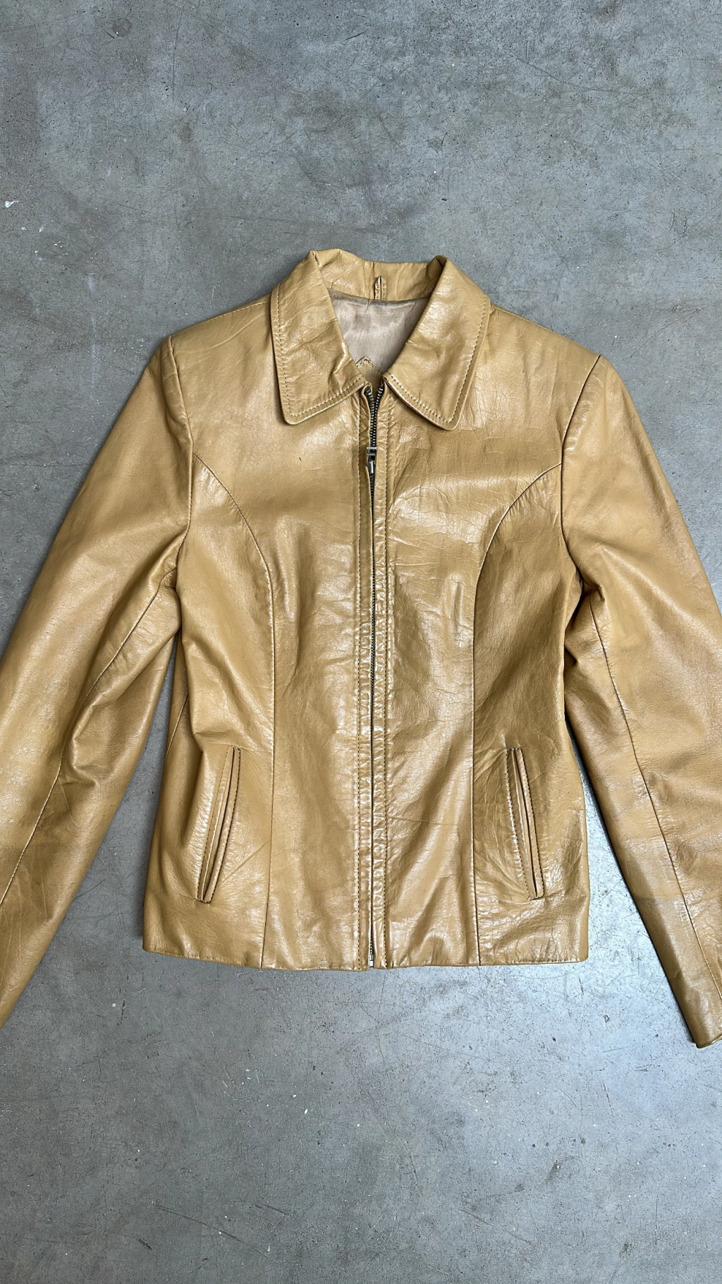 Campera 100% cuero corte clasico color amarillo claro. Interior forrado. Calce al cuerpo.