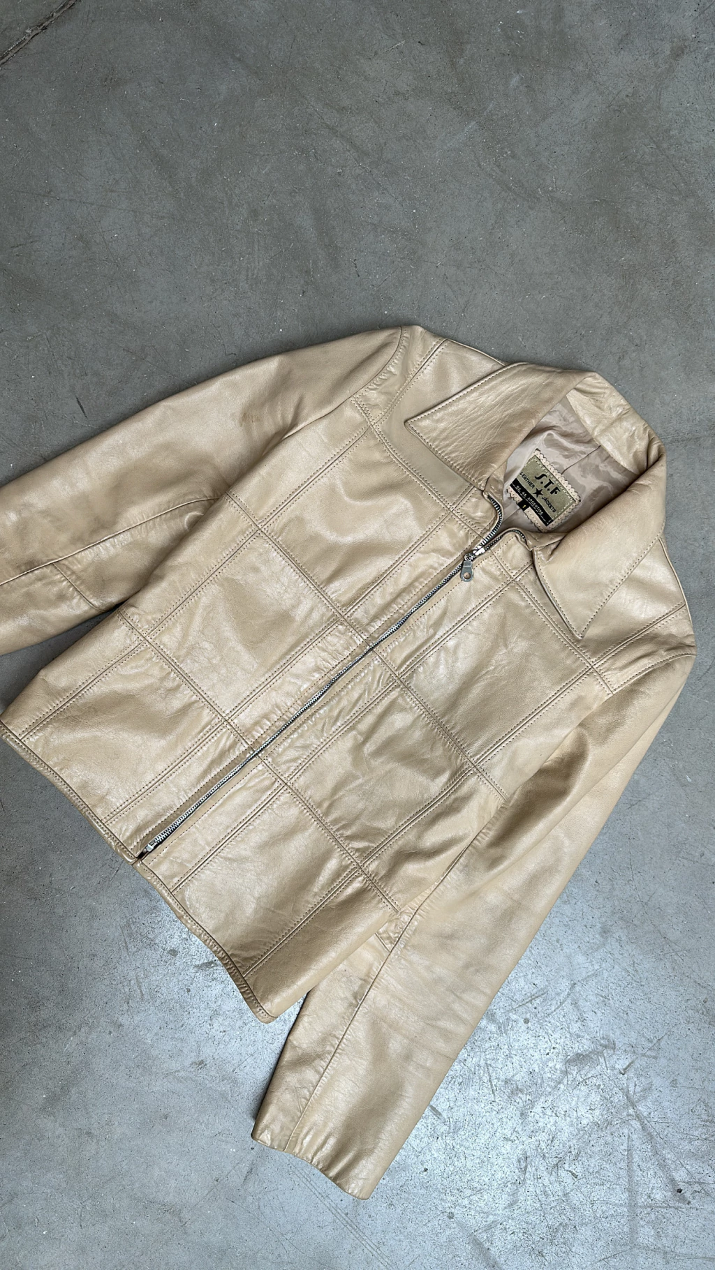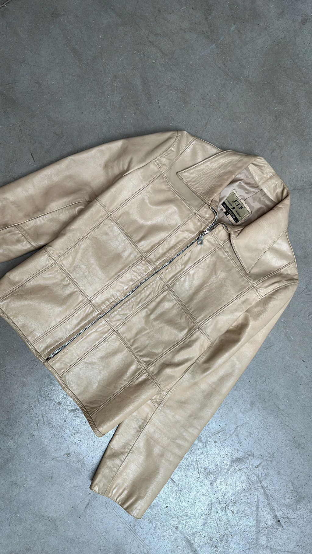 Campera 100% cuero corte clasico color manteca. Interior forrado. Calce al cuerpo.