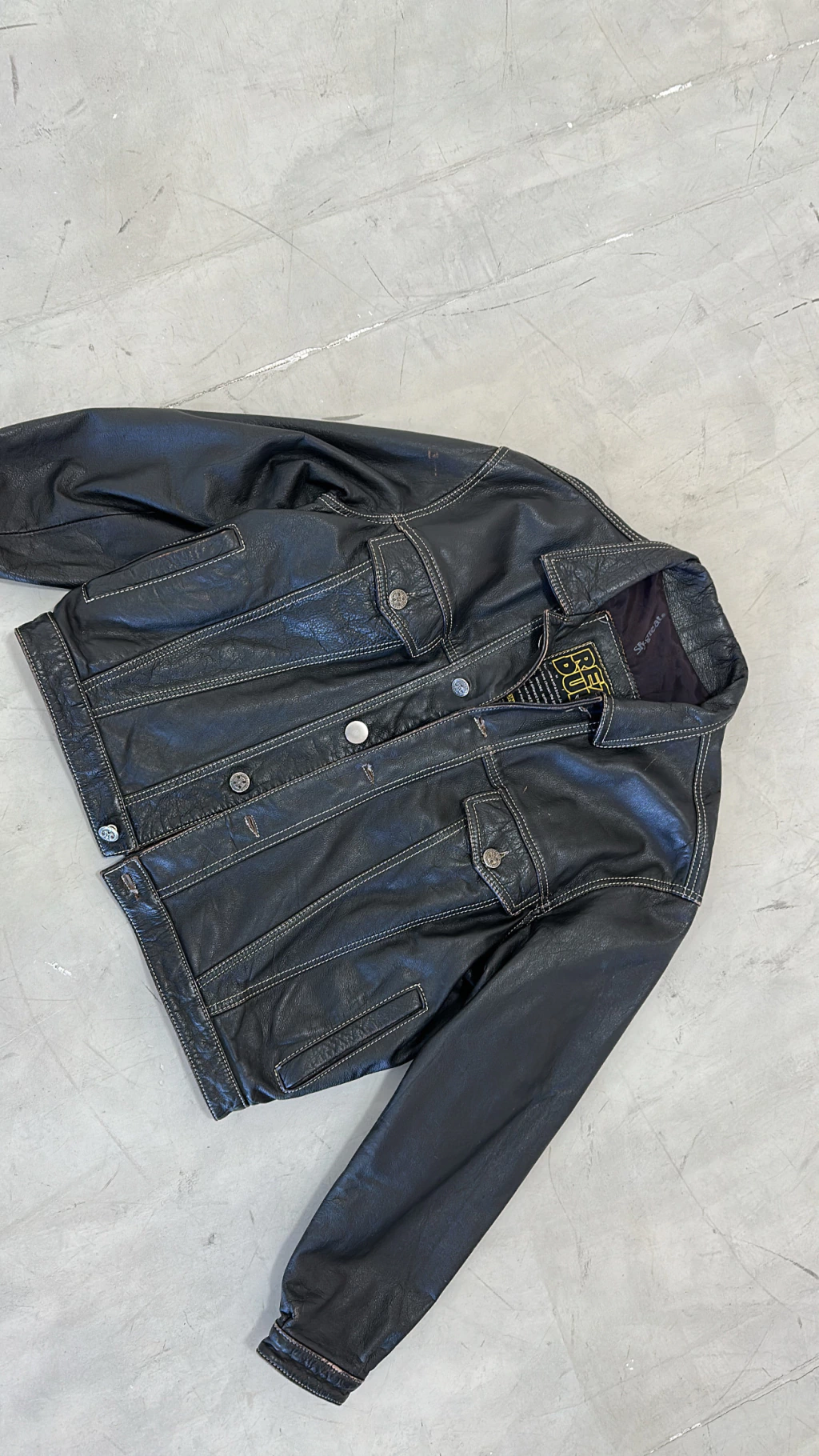 Campera 100% cuero. Unisex. Ideal para usar de día y de noche. Tiene botones y cuatro bolsillos. Interior forrado.